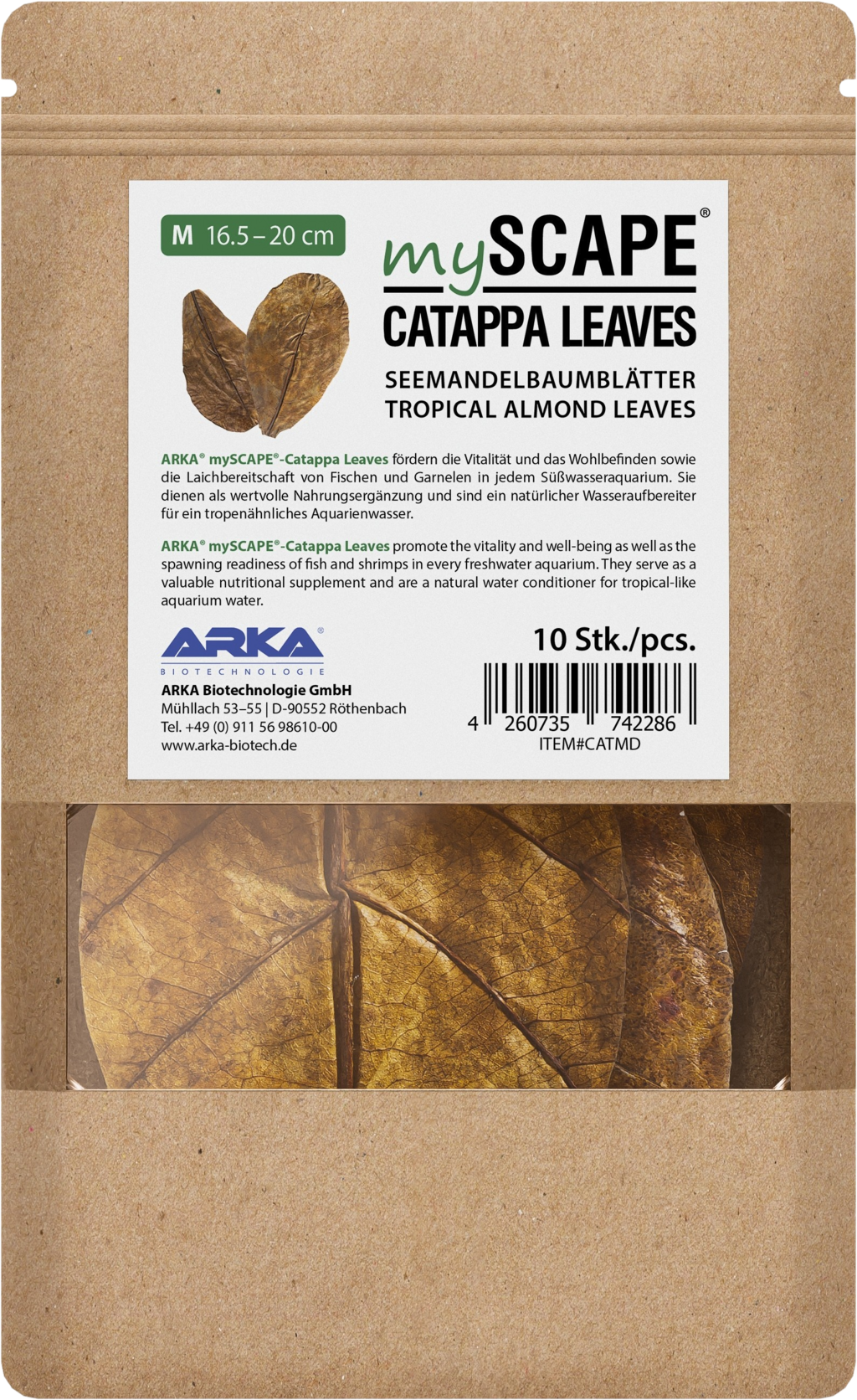 Les feuilles ARKA® mySCAPE®-Catappa favorisent la vitalité et le bien-être ainsi que l'aptitude au frai des poissons et des crevettes dans chaque aquarium d'eau douce. Ils servent de compléments nutritionnels et conditionneur d'eau naturel pour l'eau d'aquarium de type tropical.