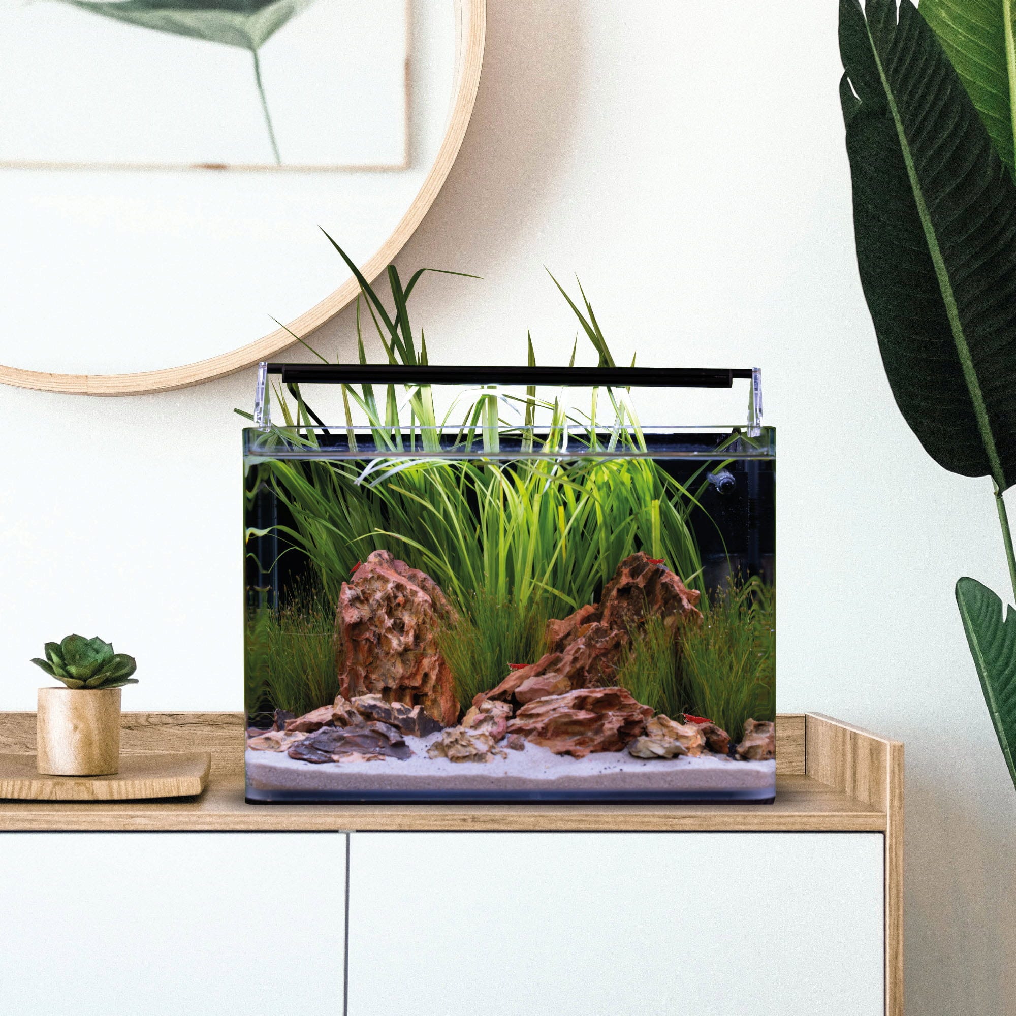 Que vous souhaitiez créer un aquascape minimaliste pour nano-poissons ou un univers coloré pour escargots et crevettes naines, cette combinaison de verre float moderne et de technologie de qualité constitue un point de départ idéal pour votre projet aquatique.