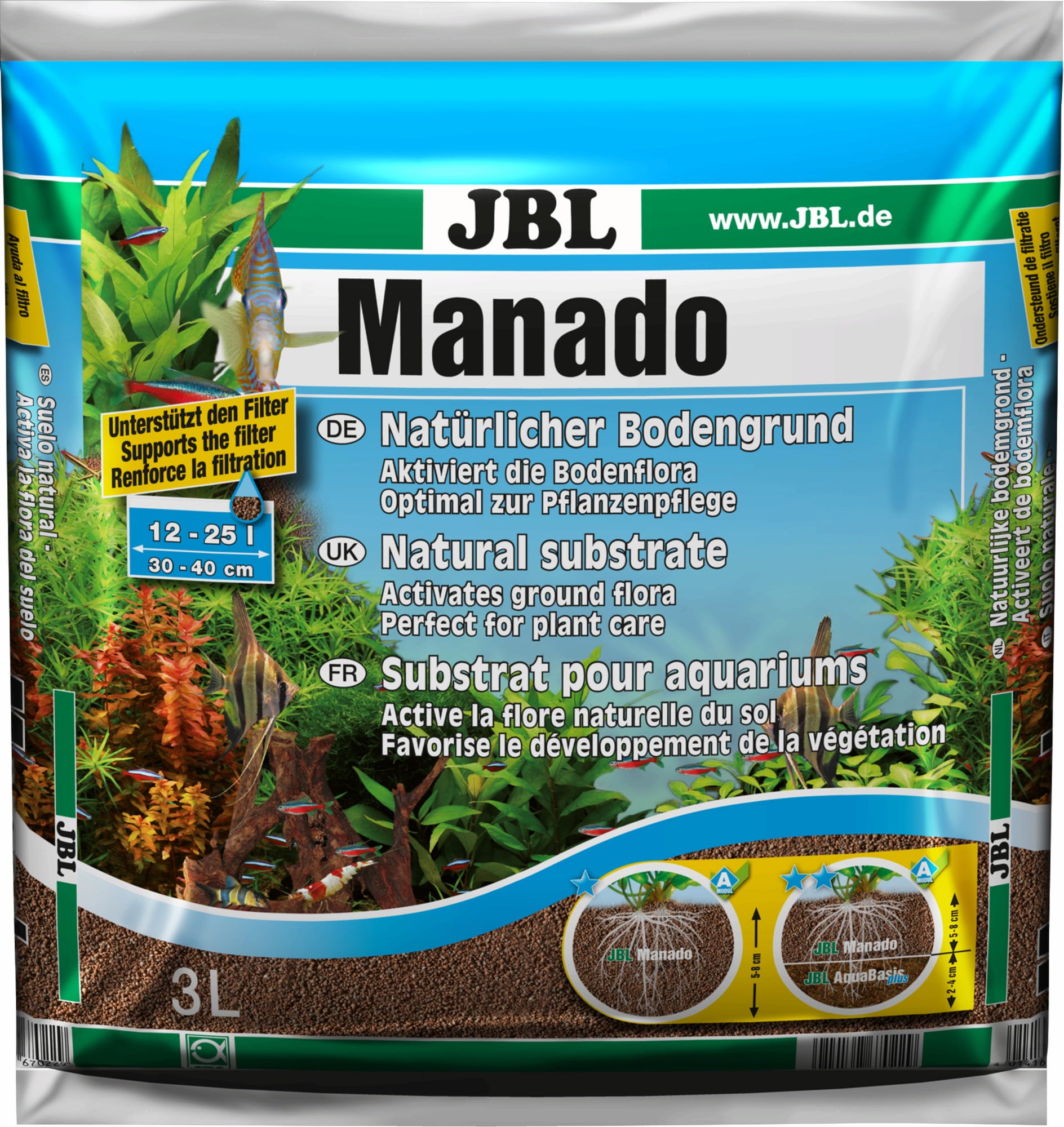 Ce substrat naturel pour aquariums d'eau douce est idéal pour l'entretien des plantes en raison de sa structure poreuse et de sa capacité de stockage des nutriments. Il permet une croissance vigoureuse des plantes et a un effet anti-algues : des bactéries nettoyantes efficaces colonisent le substrat et assurent une croissance optimale des racines des plantes grâce à la structure poreuse naturelle. Cela soulage le filtre et assure une eau cristalline. JBL Manado est idéal pour prendre soin des poissons et des invertébrés, car ce substrat ne rejette aucun polluant indésirable dans l'eau. Les granulés arrondis protègent les barbillons sensibles des poissons de fond, comme par ex. les corydoras et autres. Le substrat naturel absorbe les nutriments excédentaires et les libère en cas de besoin.