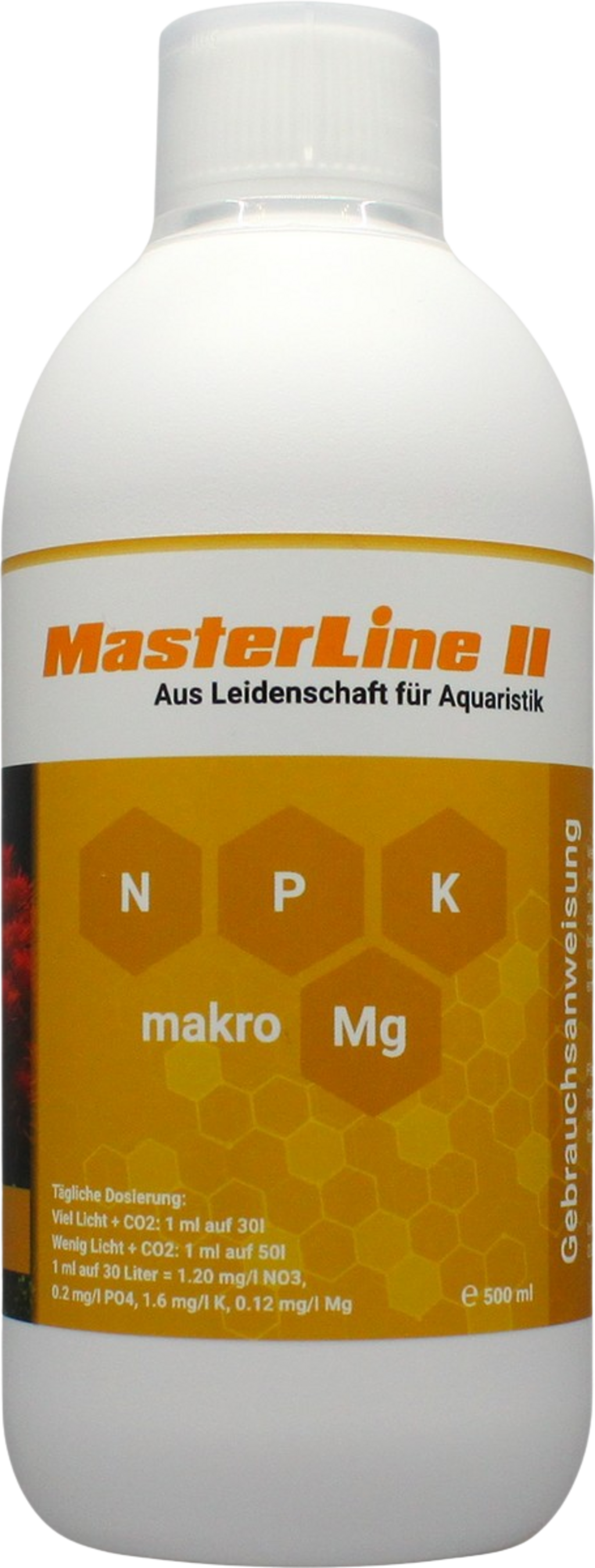 MasterLine II est un engrais concentré à base de macronutriments pour cuves avec terre et gravier. Il contient de l'azote, du phosphore, du potassium et du magnésium. La croissance des plantes est stimulée, cet engrais polyvalent prévient aussi la carence en fer. Vos plantes pourront se développer et maintenir leur couleur intense. Pour assurer un environnement sain à tous les résidents de l'aquarium, un changement d'eau de 30 à 50 % par semaine doit être effectué !
