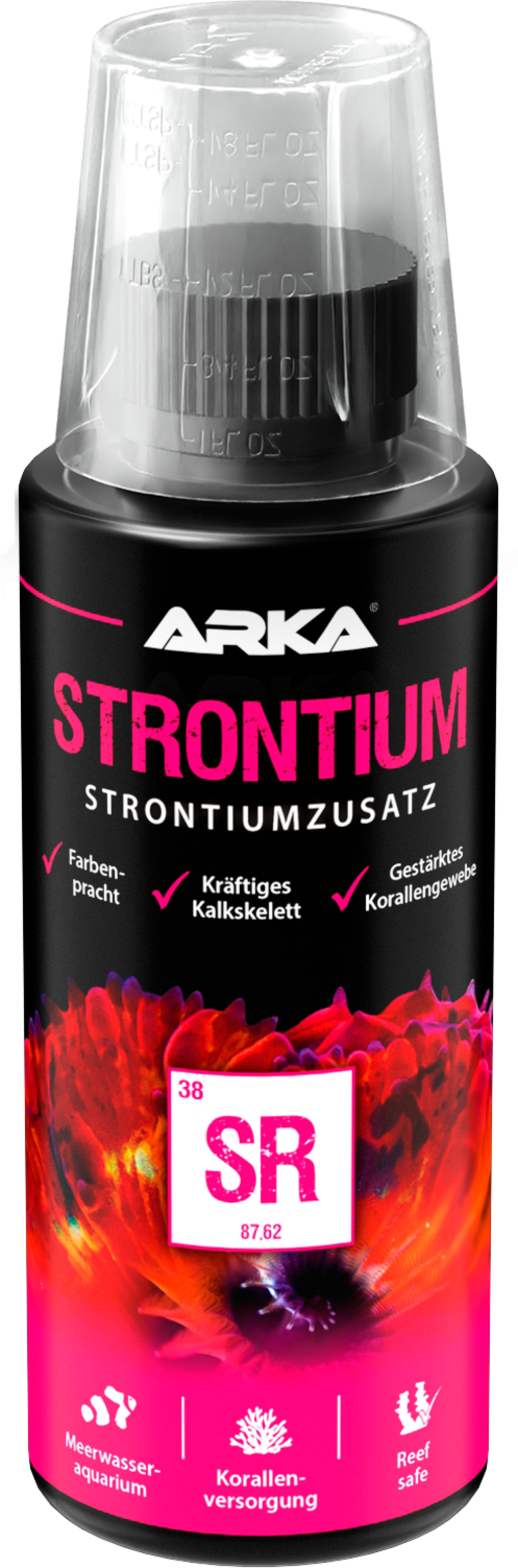 Conseil de dosage : Ajouter 5 ml pour 100 litres d'eau pour augmenter la teneur en strontium de 0,025 mg/L. (La teneur optimale en strontium est de 8 à 10 mg/L.)