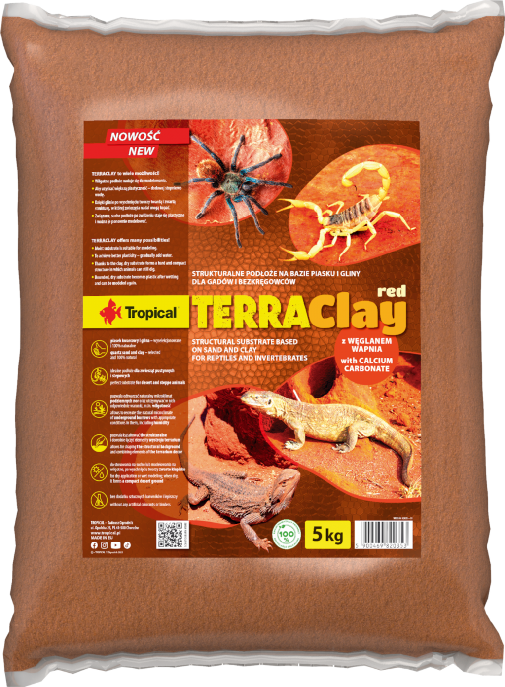Le substrat TERRAClay est un mélange de sable, d'argile et de carbonate de calcium, conçu pour recréer l’environnement naturel des animaux vivant dans les déserts et les steppes. Sa structure stable en fait un choix idéal pour les terrariums.